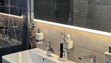 Badezimmer mit Dusche, Waschbecken mit Unterschrank, Geberit mit wandhängender Toilette und Ariston-Wassererhitzer (50/80/100 l), elektrischer Handtuchwärmer, teilweise geflieste Badezimmerwände.