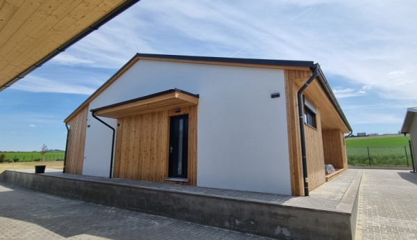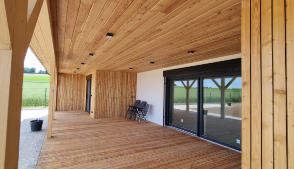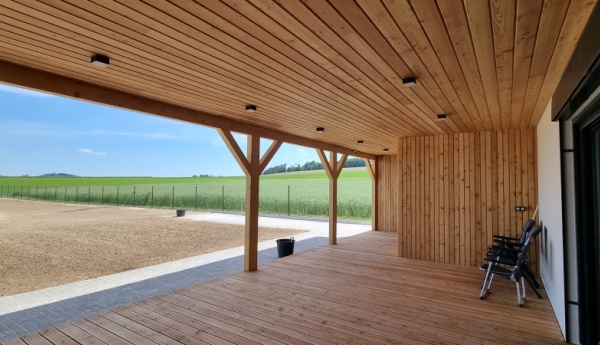 Außenverkleidung mit Lärchenrhombus, weiße Innenwandfarbe.
