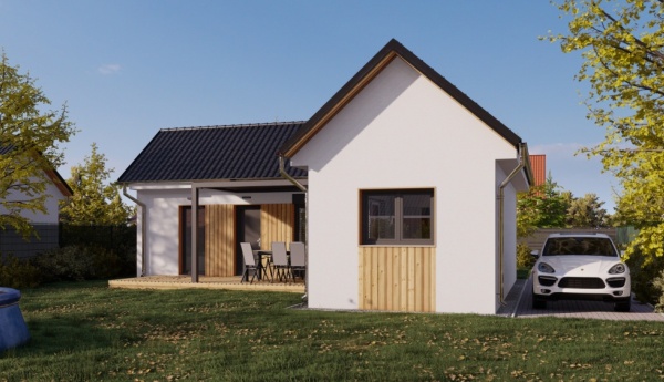 Fassade mit Lärchen-Rhombusverkleidung, weiße Wandfarbe im Inneren.